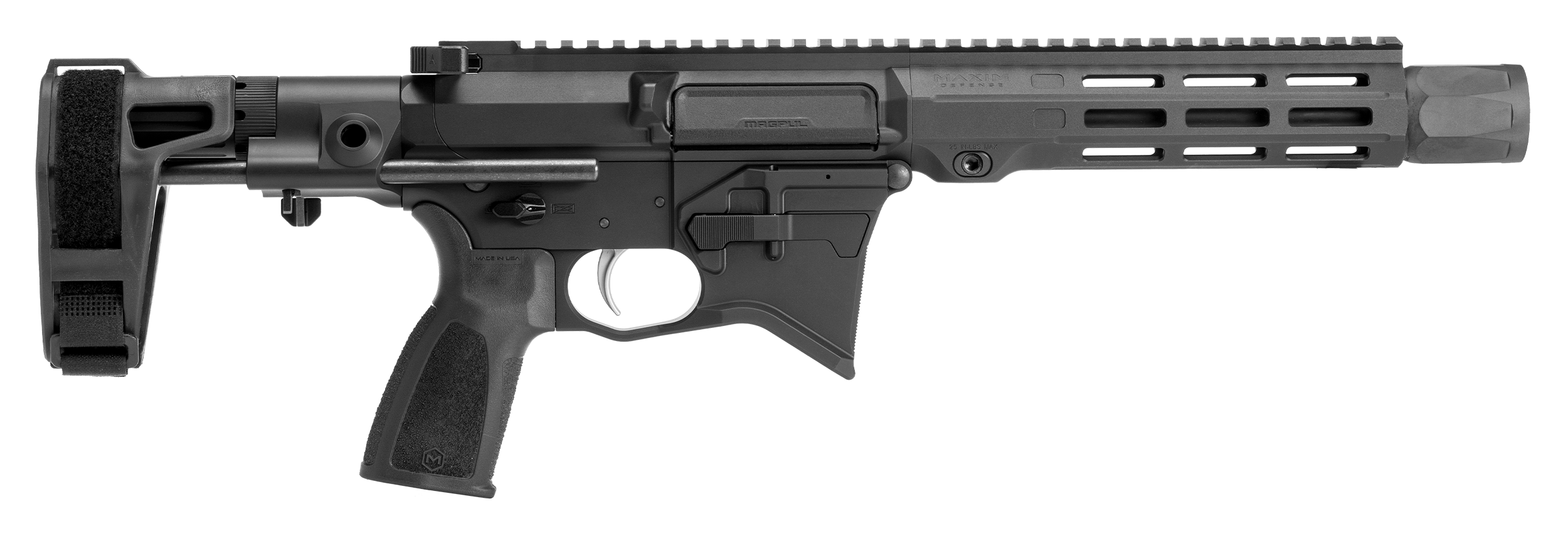The MD:9 CQB – 908 Pistol brings full-size AR-9 power into a sleek, brace-equipped platform optimized for suppressed performance and fast handling. Featuring an 8.5” free-floating barrel, our Gen:6 CQB pistol brace, and Roller Delayed Blowback (RDB) system, this build delivers superior recoil control, smooth cycling, and enhanced accuracy. Outfitted with premium components—including a Radian charging handle and safety selector, ALG Combat trigger, Maxim pistol grip, and an ambidextrous magazine release—the MD:9 CQB is purpose-built for defensive and duty-driven scenarios.